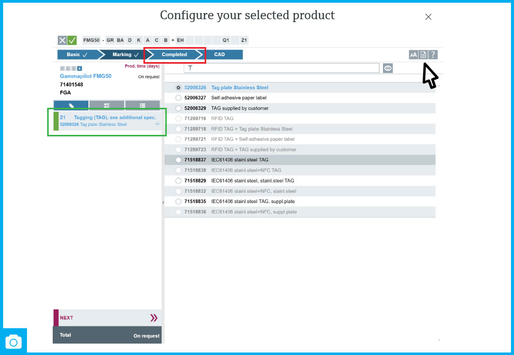 After selecting all the required parameters, the system generates a special product modification code , which is displayed at the top of the configurator.